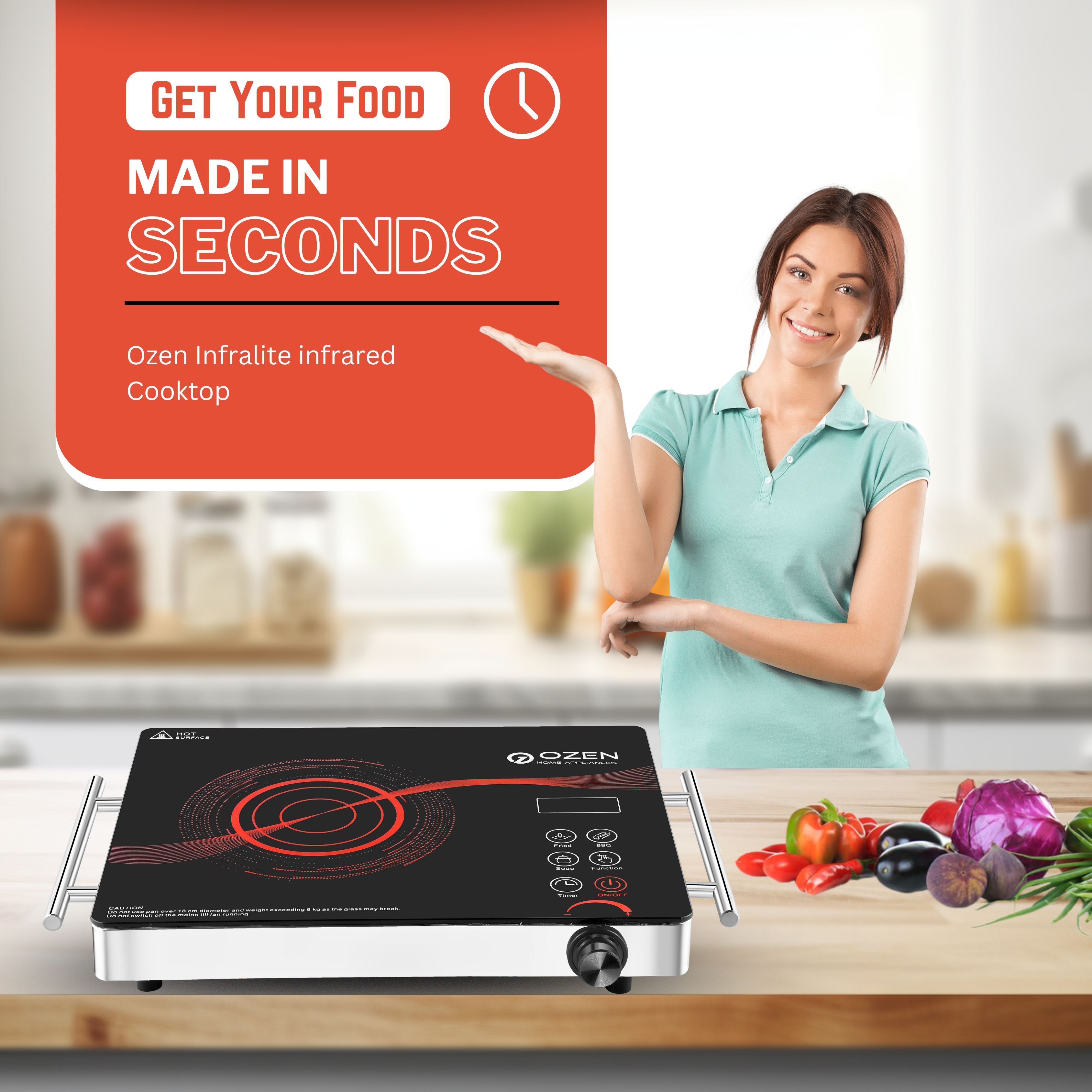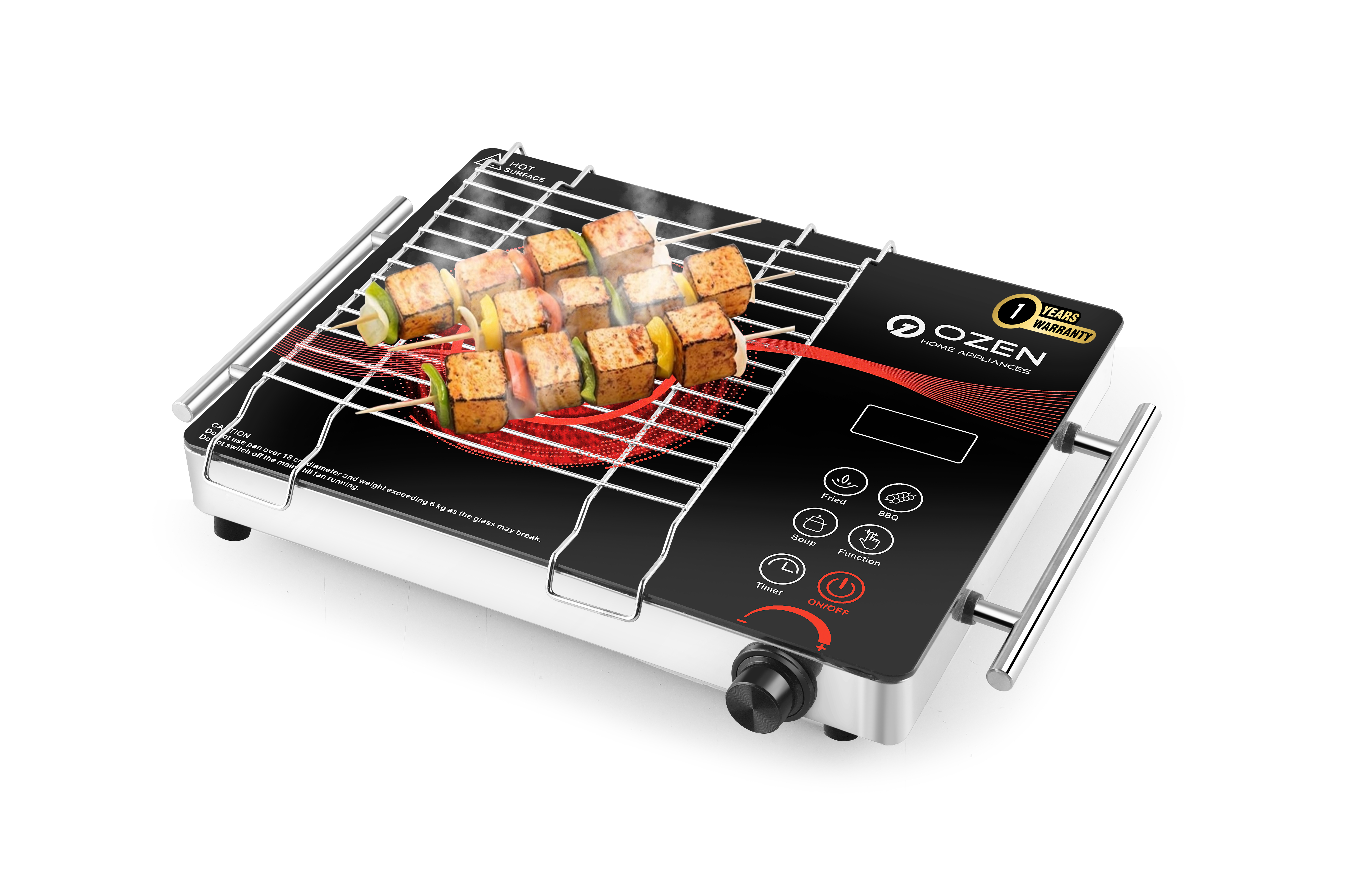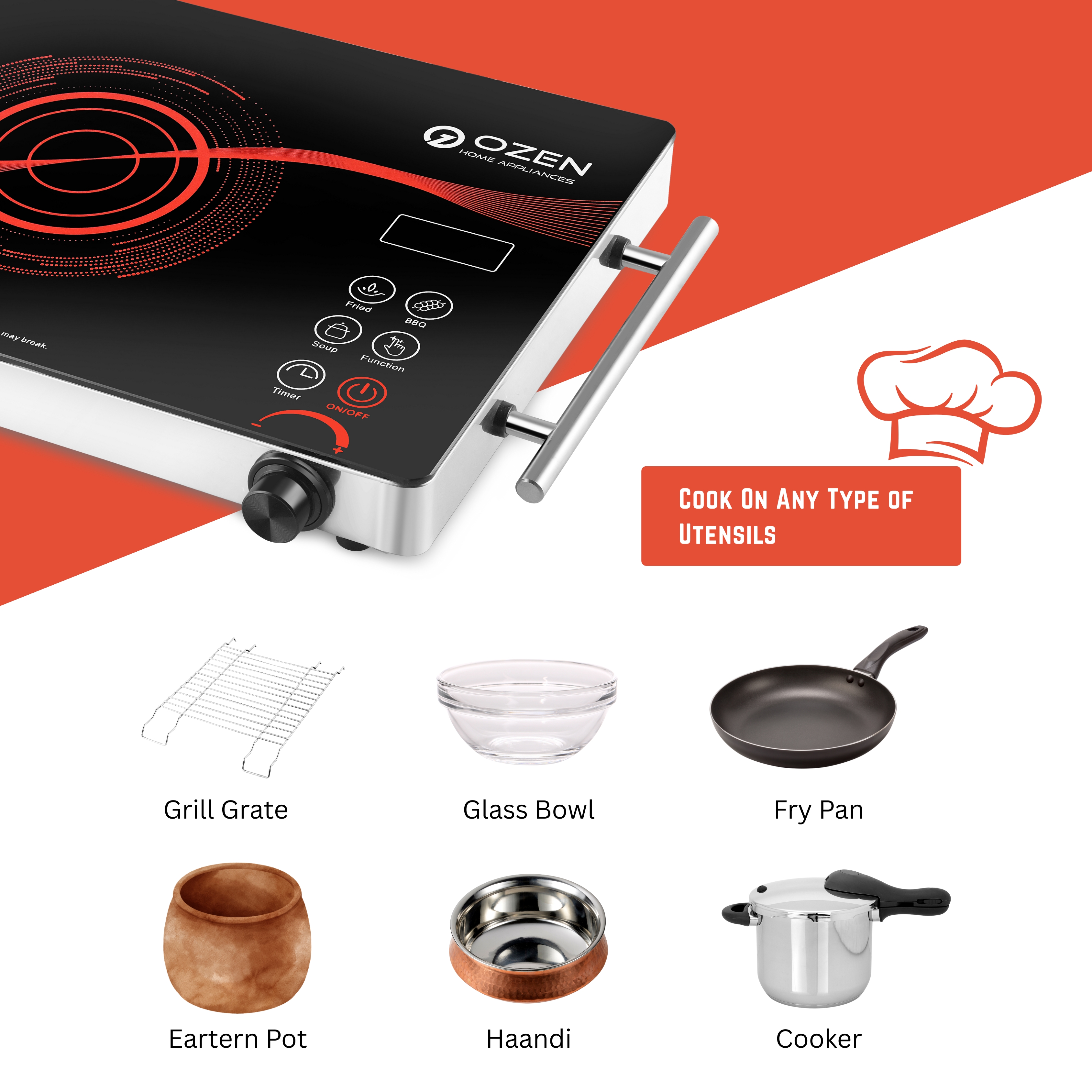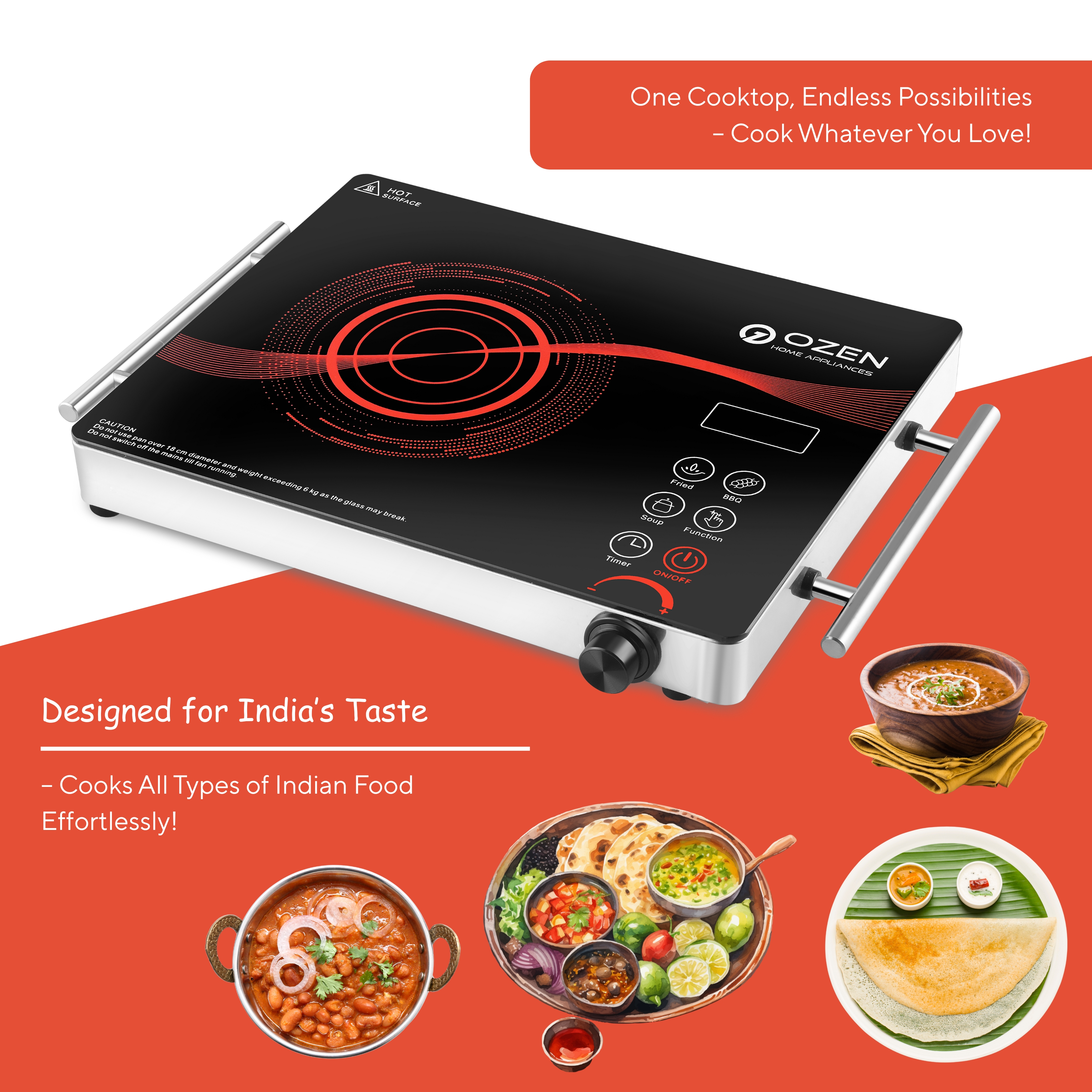 Product Overview: OZEN HOME APPLIANCES presents a whole new range of electric induction cooktops. The product is powered by a strong 2200-watt infrared heating element that provides longevity and smooth, quiet cooking. It comes with various modes for cooking and a digital LED touch panel display for easy operations. It is also powered by auto pan detection feature and automatically switches off when not in use or at very high temperature. It is the perfect addition to your kitchen to make your cooking process efficient and quick. Infrared Cooktops- The New Era of Cooking: Introducing our latest portable infrared cooktop, designed to revolutionize your cooking experience. Our infrared cooktop uses innovative heating technology that utilizes infrared radiation to heat the surface of the cooktop. This allows the cooktop to heat up quickly and cooks your food evenly. Infrared heating makes it more energy-efficient than gas or electric cooktops because it only heats up the cookware, not the surrounding air. It comes with a sleek and modern design that comes with a glass or ceramic surface that is easy to clean and maintain. It is equipped with various features such as touch controls, digital displays, and safety features like automatic shut-off. Safety Features: OZEN HOME APPLIANCES’s premium infrared cooktop comes with various safety features to prevent accidents. These include automatic shut-off, overheat protection and high/ low voltage protection. It helps in preventing the damage to the cooktop and other electrical components that extends the life of the appliance. Energy Efficient: Induction cooktops are extremely energy efficient because they heat only the cookware, not the surrounding air. It allows you to precisely control the temperature of your cookware, that makes cooking delicate dishes easier and saves electrical energy. The auto shut down feature cuts power when no key is pressed in two hours. This is to prevent the cooktop from overheating and potentially causing a fire or other safety hazards. Compatible with all Utensils: Our infrared cooktop is compatible with all types of cookware including stainless steel, cast iron, glass, ceramic and even earthen pots.